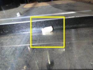 確認したところ、電子タバコのフイルター部分を台のパネルの下部に挟むと、台をパネルを開閉(設定作業等)際にフイルターは下の写真のようにパネルと筐体に挟まれるように移動しました。フイルターは、右側面や台の下部中央部分に隠されていることもあります。フイルターがパネルと筐体の間に挟まれなくとも、挟んだ場所から移動していれば、設定変更のために台を開閉したことが確認できます。このフイルターを挟む行為は複数の店舗で確認されていますが、確認された機種が「マイジャグラーVKD」のみで、そのほかの機種にはフイルターを挟む行為は確認されていません。このことから「アイムジャグラーEX-TP」や「新ハナビ」等で行われていた設定変更判定のシールを使用していたものの、店舗で対策としてテープの除去が行われているために、「マイジャグラーVKD」に対してはフイルターを挟む行為に変更したものと思われます。このフイルターを挟む行為は容易に行えるため、多くの不良客(ゴト師関係者)が始めたものと思われます。